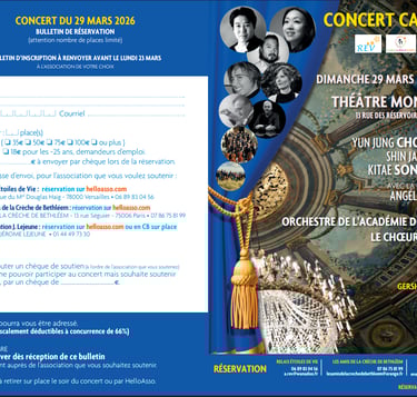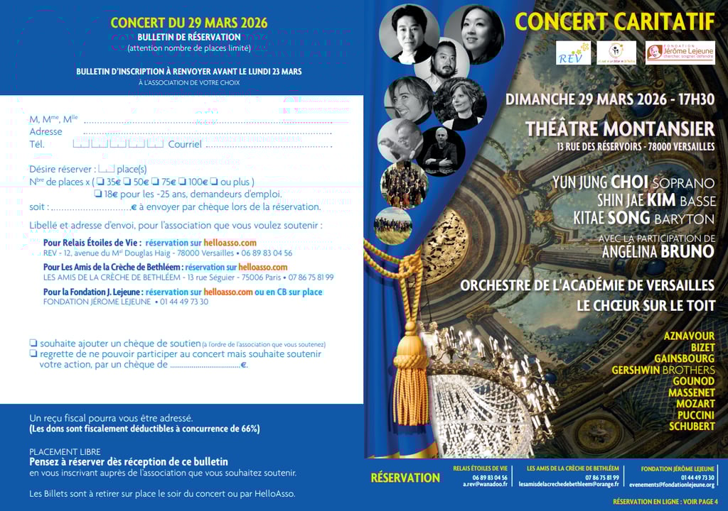 Nous aurons le plaisir et l'honneur de participer au concert caritatif organisé le dimanche 29 mars 2026 à 17h30 au Théâtre Montansier, au profit de REV (Relais Etoiles de Vie), les amis de la crèche de Bethléem et la Fondation Jérôme Lejeune.